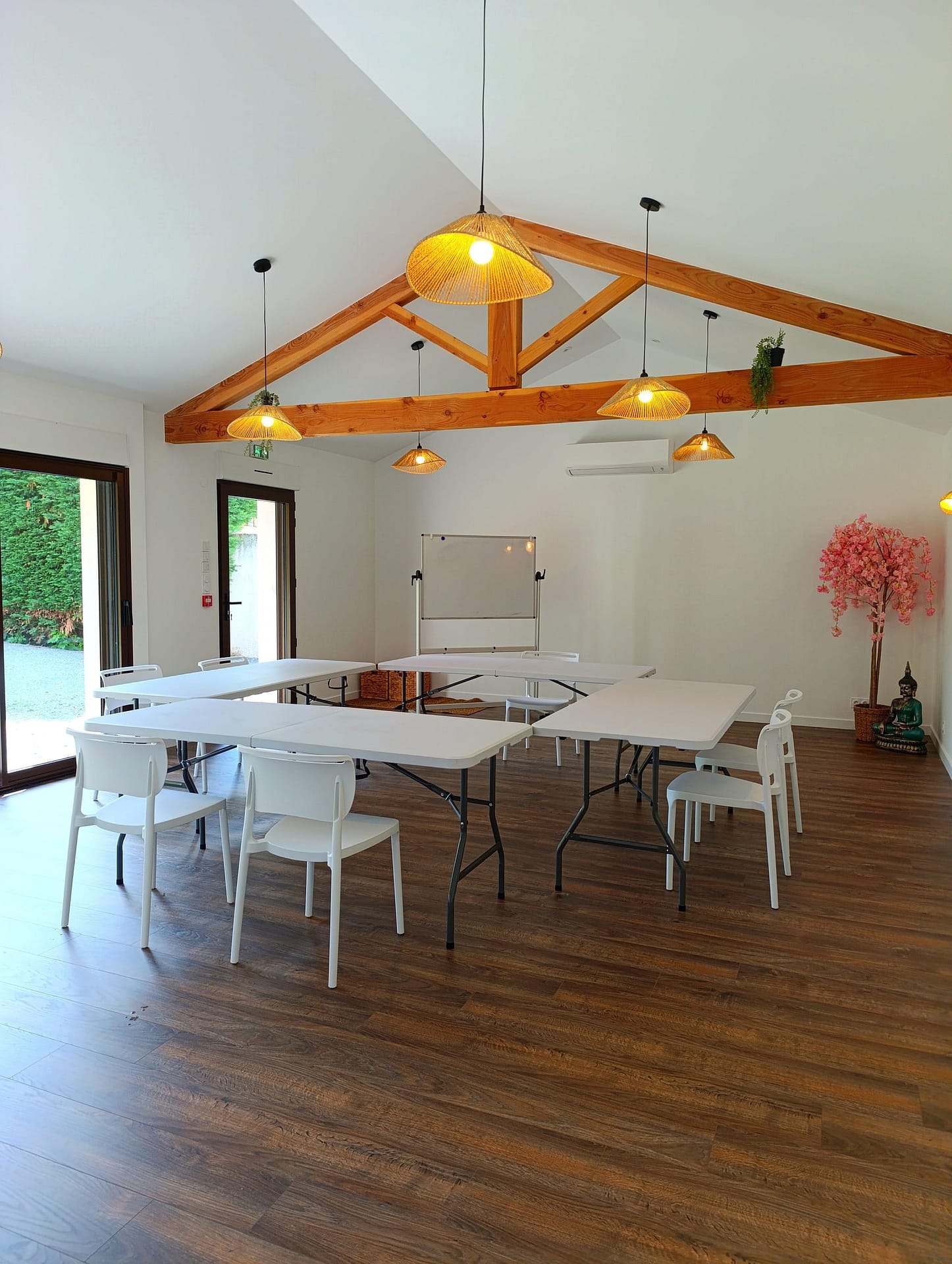 Composée d’un grand espace de travail idéal pour vos conférences, formations, ateliers bien-être ou encore journées coworking, elle peut accueillir jusqu’à 40 personnes en mode conférence.
