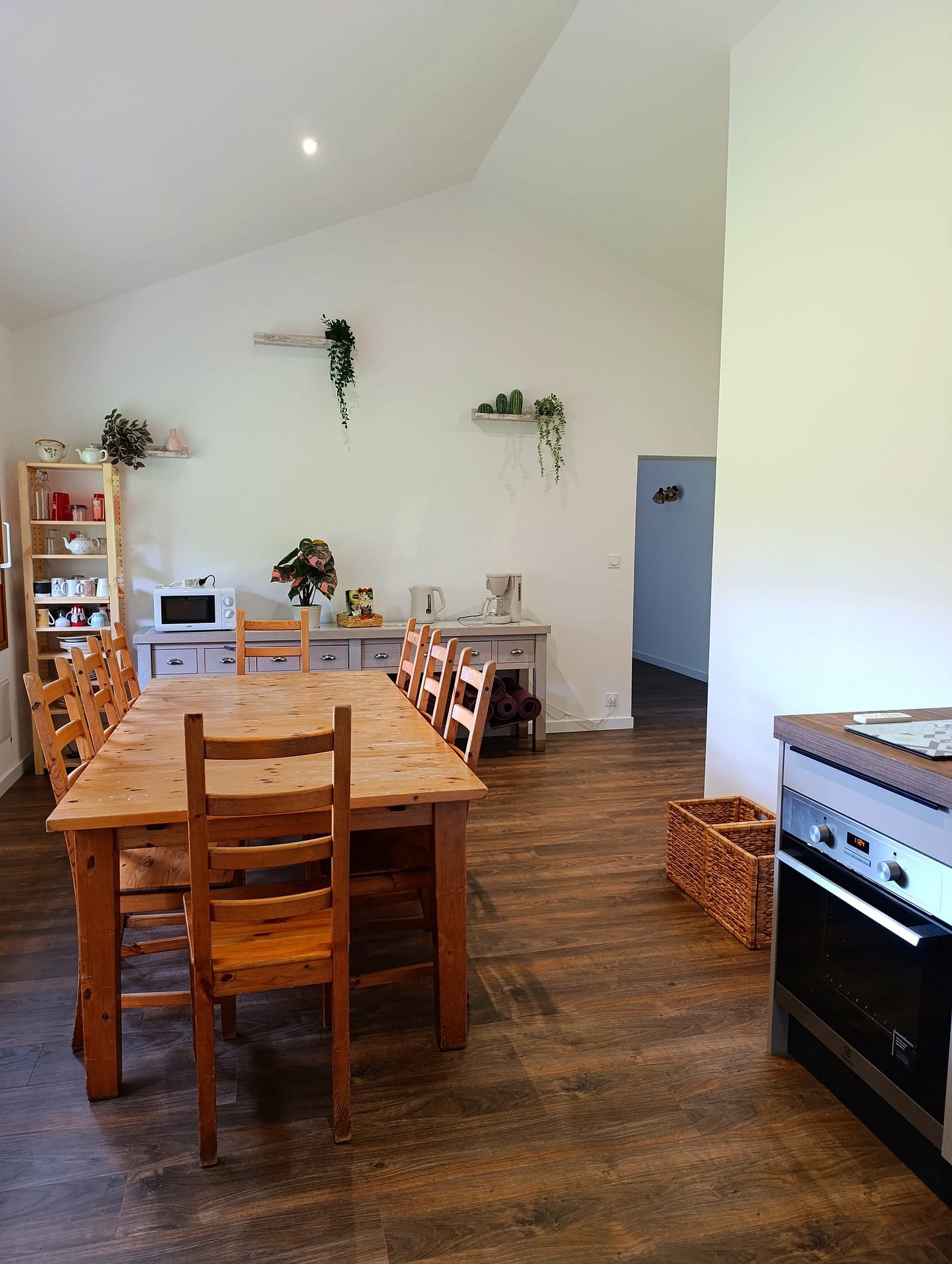 Une cuisine attenante toute équipée (four, plaques de cuisson, frigo, micro-ondes, cafetière, bouilloire, vaisselle) vous permettra de prendre vos repas sur place.